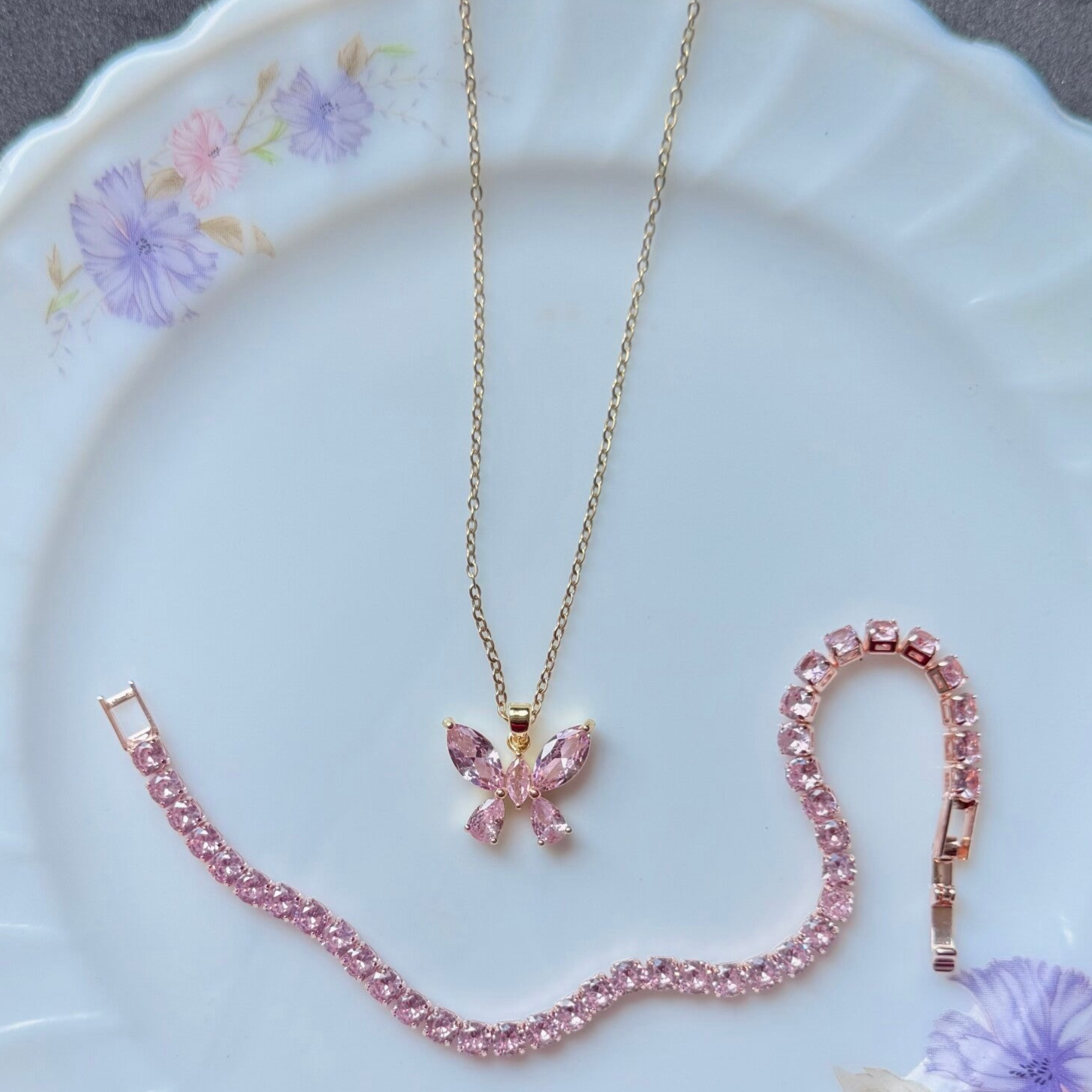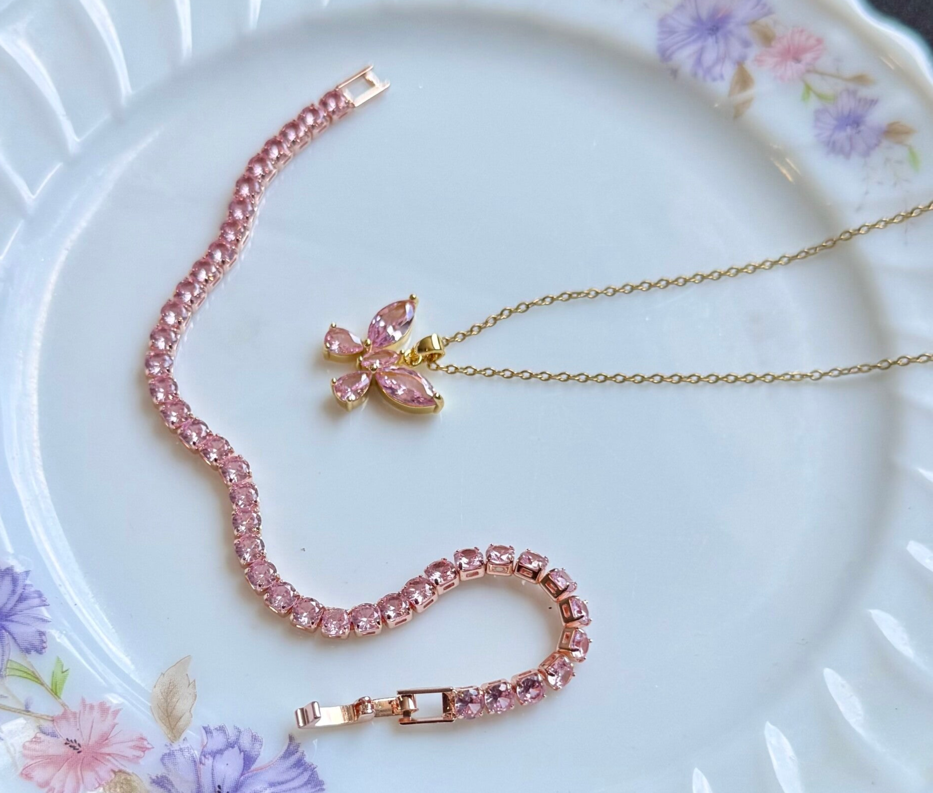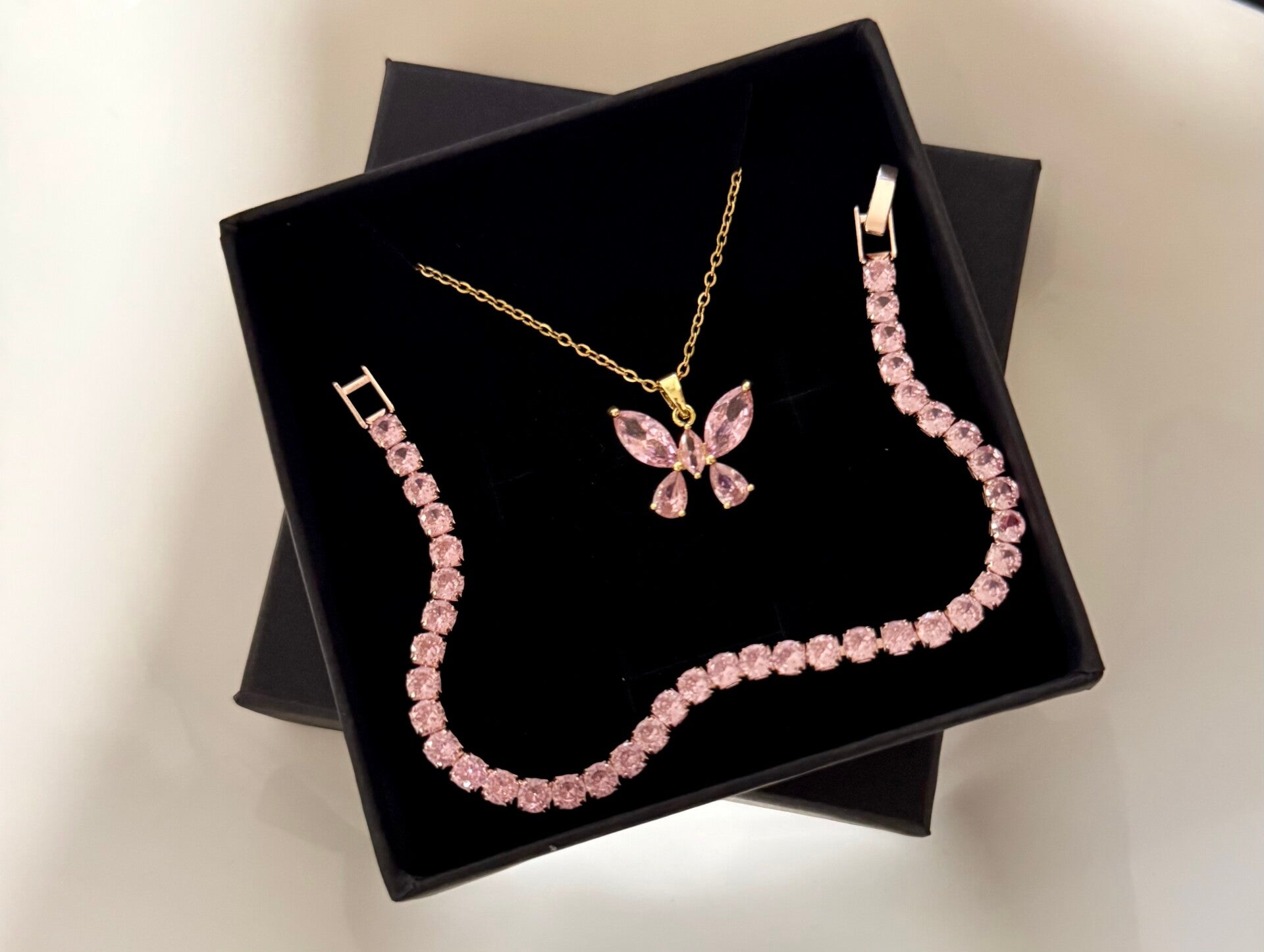 composé d'un collier ajustable et d'un bracelet assorti et zirconium de couleur rose ✨